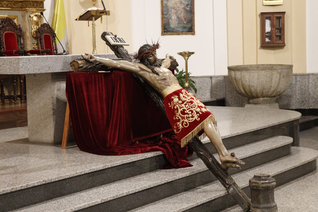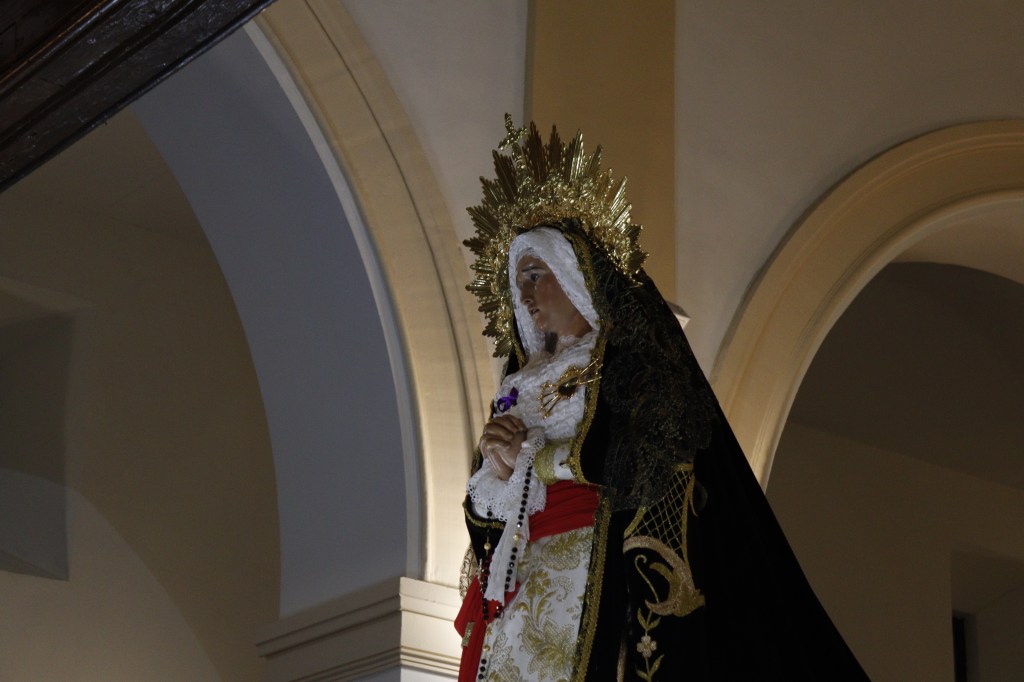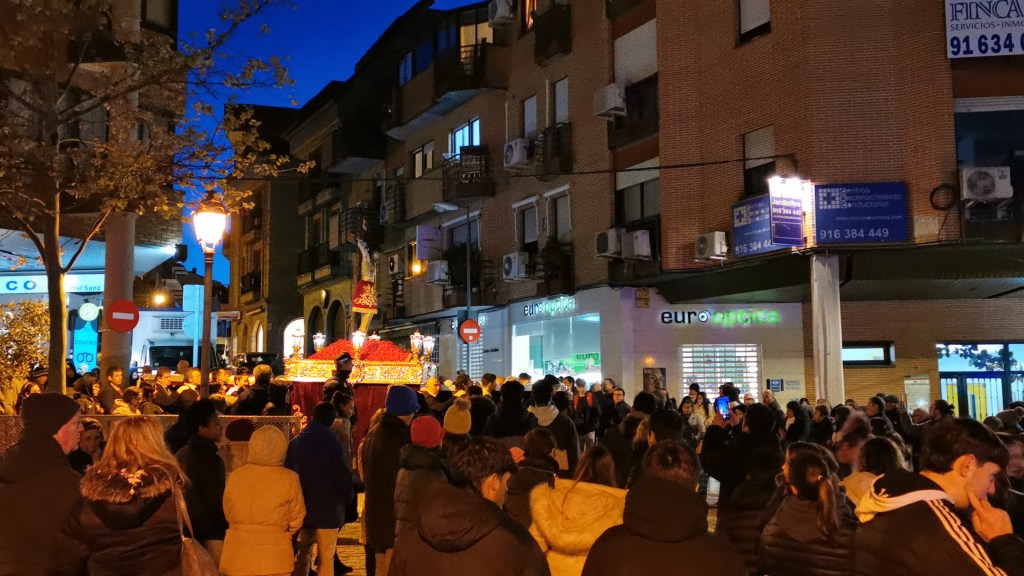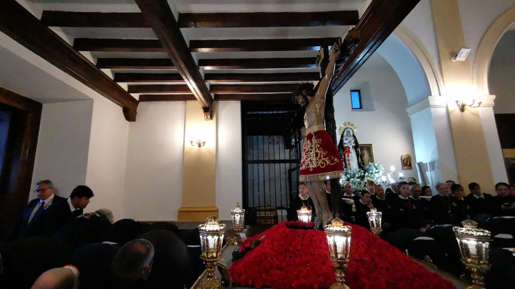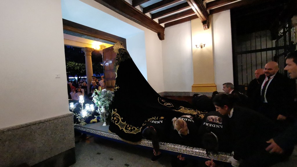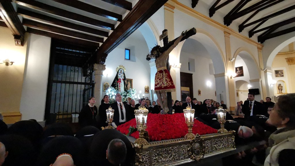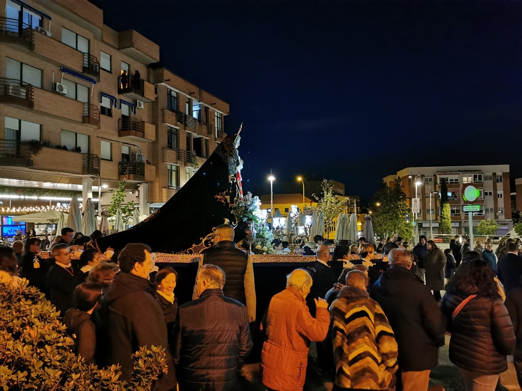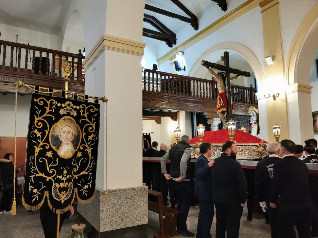 Llegado el momento de su traslado los anderos sobre sus hombros le situaron en su trono frente a la Virgen de la Soledad que aguardaba para acompañarlo, la que nunca abandonó a su Hijo y se mantuvo a los pies de la cruz, como recordó el Párroco Juan Francisco Pérez Ruano a los que como bien dijo “ponen toda su fuerza y amor en este servicio, que no se queda solo en lo que hoy lleváis encima sino que además nos tiene que ayudar a vivir todos los días”, los anderos, anderas, y capataces de Jesús el Pobre de Madrid, con los que rezó un Padre Nuestro e impartió su bendición antes de partir.