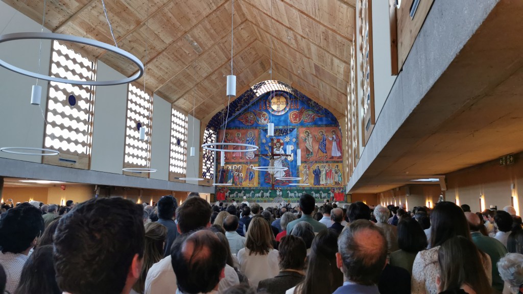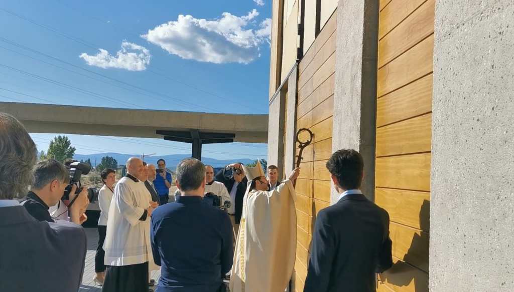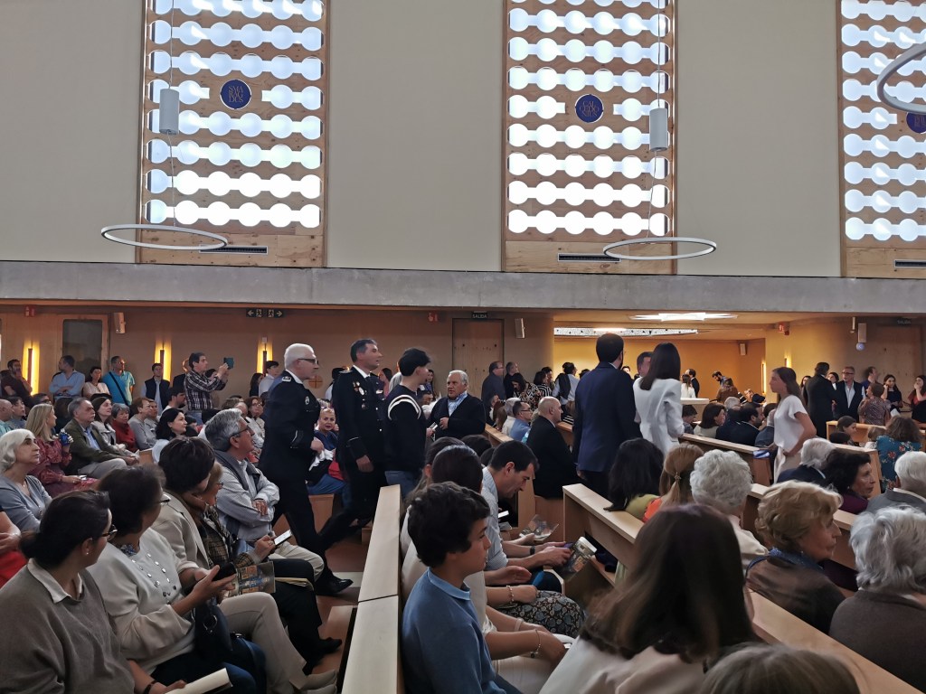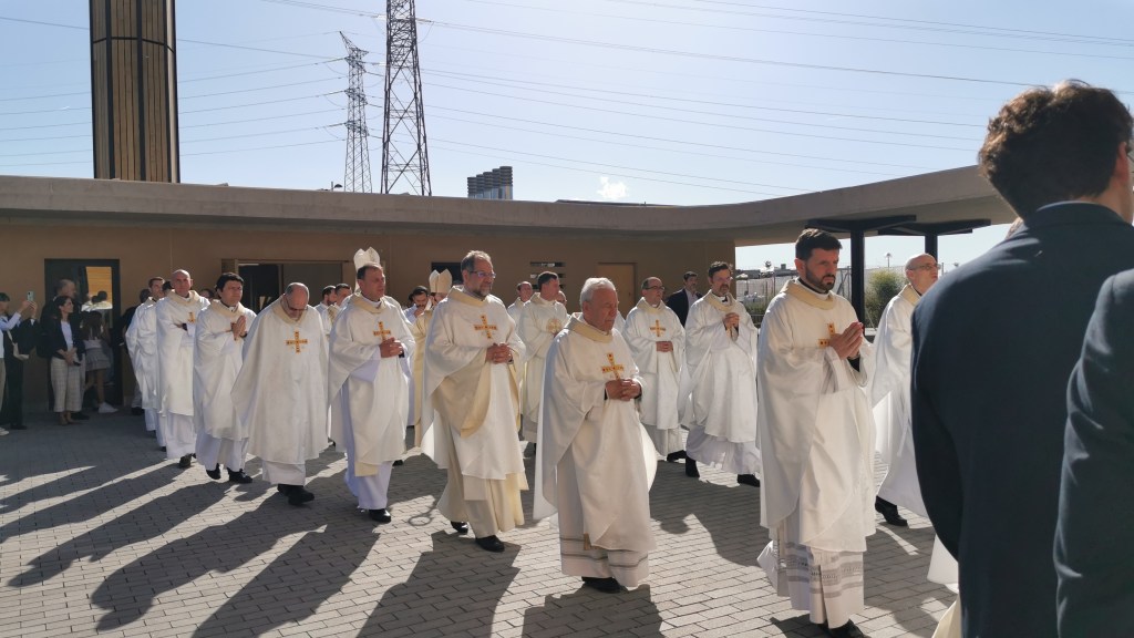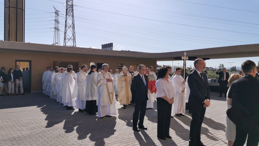 Ayer domingo 21 de abril (2024) a las 18:00 horas el arzobispo de Madrid con su báculo golpeó tres veces las enormes puertas cerradas del nuevo templo de Santa Genoveva para solicitar su apertura y atravesar el umbral portando el libro de los Evangelios en compañía de numerosos sacerdotes, gesto con el que se representa que “Jesús ha abierto de par en par la puerta de Dios, la puerta entre Dios y los hombres”. ya en el interior se procedió a la bendición del lugar así como a la celebración de la eucaristía, durante la cual y según hace referencia al Archidiócesis de Madrid en su comunicado del acto, el cardenal José Cobo en su homilía reconoció «Si esto tiene sentido es porque, como dice el Evangelio de hoy somos convocados, llamados con otros, somos constituidos comunidad por la llamada de aquel que siempre nos busca: el Resucitado«, a lo que añadió «no podemos olvidar que hay una piedra fundamental. Cristo es quien sostiene todos los pesos de este edificio y de cuanto significa. Dios habita en nosotros, en cada uno. Por muchos templos que edifiquemos no podemos perdernos el milagro de ser nosotros su templo, y de poder traslucir su presencia cuando construimos la comunidad cristiana: ese es su templo fundamental«. Para finalizar el cardenal realizó un reconocimiento a todos los que con su esfuerzo han hecho realidad este templo, y dirigiéndose al párroco David Benítez, a todos los sacerdotes y a todos los presentes, les recordó que «Jesús pone personas y voces que nos ayudan a no perder el Norte y a escuchar su voz. Gracias por quedar vuestras vidas vinculadas a este templo«. Y en referencia al altar, que posteriormente fue ungido con óleo santo, dirigió una bonita bendición «brote un río constante de gracia y caridad sobre Majadahonda y sus gentes«.