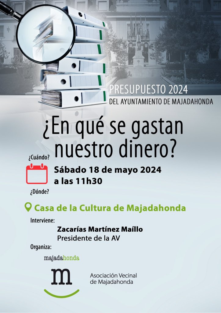 Este pasado sábado 18 de mayo (2024) la Asociación Vecinal de Majadahonda, dentro de su propuesta mensual de plantear charlas informativas de acceso libre sobre temas de actualidad e interés para el municipio y su posterior debate, decidió centrar su atención, en esta ocasión, en informar y esclarecer ¿en que se gastan nuestro dinero los dirigentes municipales?. Las posibles dudas, que seguramente a muchos nos afloraron cuando el pasado mes de octubre (2023) el Ayuntamiento de Majadahonda anunciaba “El Ayuntamiento contará con un presupuesto de 86,7M€ en 2024 sin subir los impuestos a los majariegos” nos hacen reflexionar sobre este tema tan delicado y a la vez tan importante pues la economía de un municipio, y consecuentemente las arcas municipales no son cuestión de magia sino de realidad. Una equivocación al principio puede derivarnos a un punto y seguido tan indefinido como deficitario tanto en «euros constantes y sonantes» como de servicios bien gestionados.