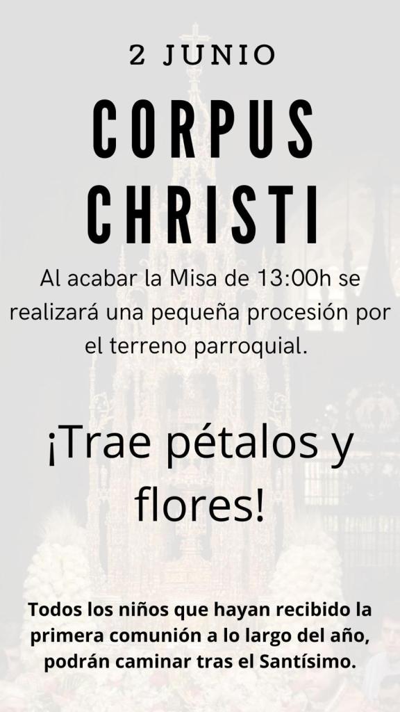 La Parroquia de Santa Genoveva, en su nueva ubicación en la Calle Las Bodas de Fígaro 26, tras la Misa de 13:00 horas realizará una pequeña procesión en el recinto parroquial, en la cual los niños y niñas que hayan recibido la primera comunión a lo largo del año, podrán caminar tras el Santísimo. «¡Trae pétalos y flores!».