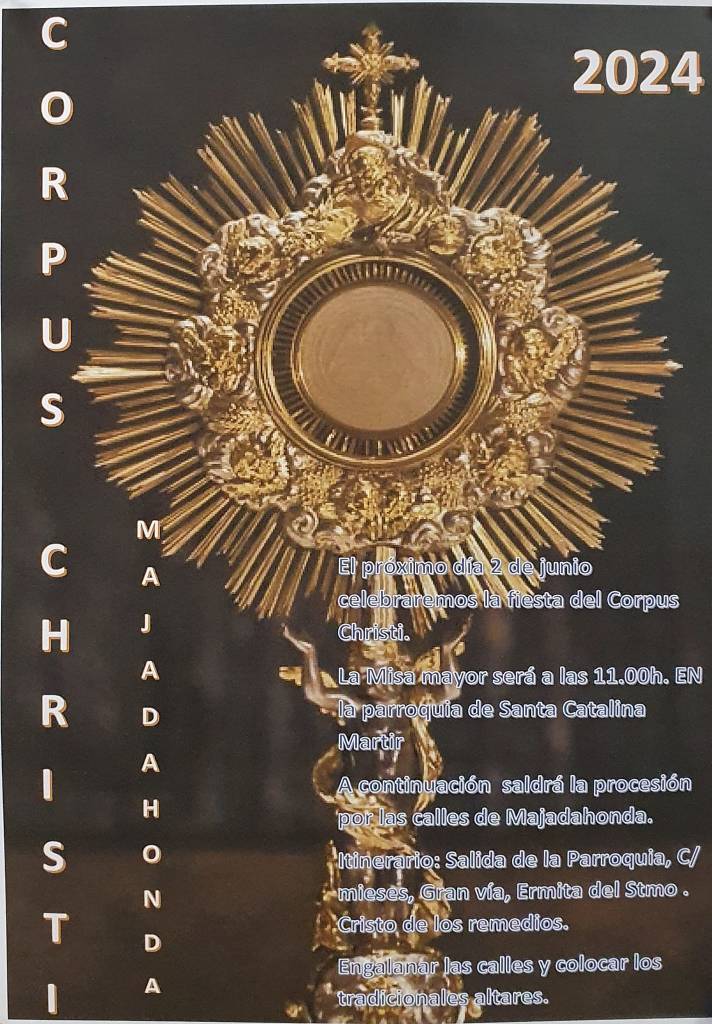 La Parroquia de Santa Catalina Mártir festejará este día con una Misa mayor a las 11:00 horas, para seguidamente salir en procesión por las calles de Majadahonda. Con el siguiente itinerario: Calle Mieses, Gran Vía, hasta llegar a la  Ermita del Santísimo Cristo de los Remedios. En su recorrido serán bendecidos los tradicionales altares que con esmero y devoción instalan los vecinos al paso de la procesión. La cual contará con el acompañamiento de los niños y niñas que han recibido su primera comunión este año.