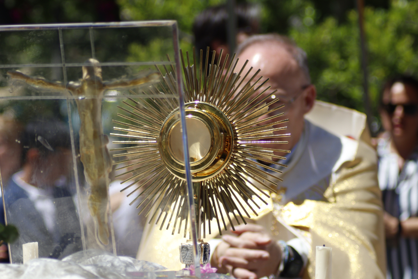 De esta manera y bajo palio el Santísimo fue portado por el párroco Juan Francisco Pérez Ruano y el Vivario parroquial Fernando, quienes ataviados con el velo humeral depositaron la custodia en los diversos altares que los vecinos instalaron a lo largo del recorrido, orando en cada uno de ellos y purificando con incienso el lugar.