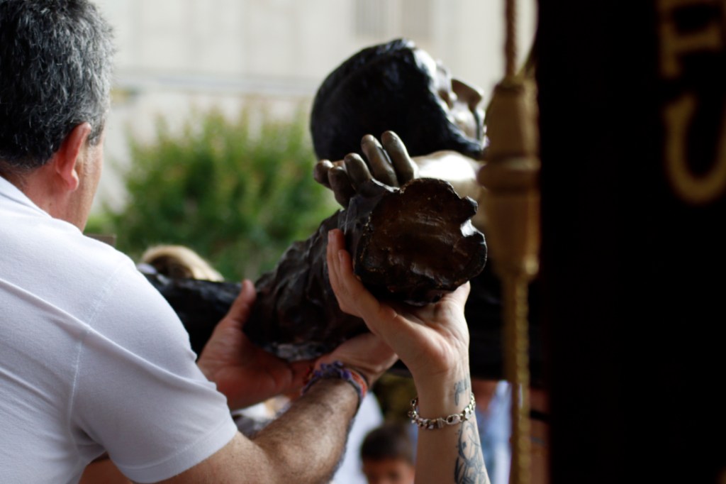 Una vez en el exterior, sobre los hombros de los anderos y anderas que días antes se preparan para tan ardua labor, la venerada imagen recibió los aplausos de los asistentes, y el recibimiento musical.
