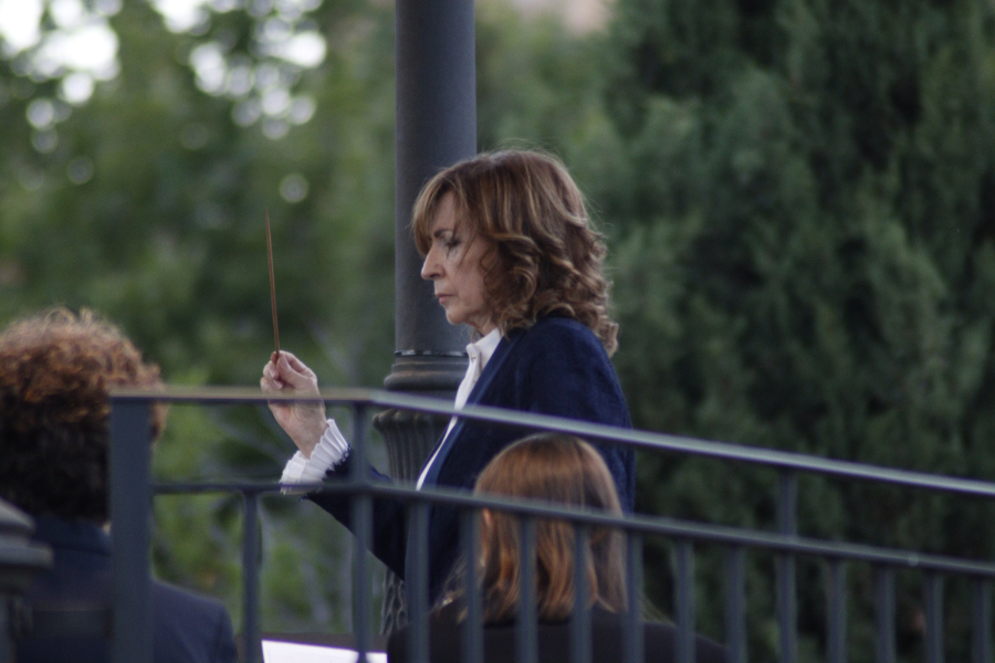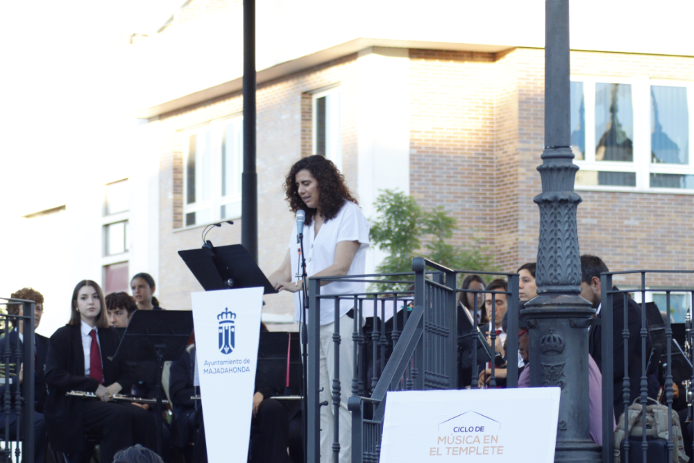 Llegado el momento de los discursos estos fueron breves y emotivos, comenzando por el de Mercedes Padilla, su extenso currículo lo resumimos, no sin mucho esfuerzo, en unas líneas con las que la Banda de Música hacía referencia a su persona “Directora, fundadora de la Orquesta Villa de Madrid, reconocida pionera en su campo, rompiendo techos de cristal. Mujer ejemplar en un mundo tan difícil, estamos encantados con lo mucho que nos ha enseñado en los ensayos”. La cual tras entre sus agradecimientos dijo “Quiero agradecer este homenaje que me ofrece la Banda Municipal de Majadahonda representada por su directora María Eugenia Navarro y también agradecer al Director titular Miguel Fernández, que son los que están luchando cada día para que hagamos conciertos y suene la música en Majadahonda” a lo que añadió “Este homenaje es para mí muy entrañable, lo acojo con mucho cariño porque ya hace 30 años que vivo aquí, soy madrileña pero Majadahonda también es Madrid, y después de treinta años lo considero mi casa”. Ensalzando la gran labor que realizan estos músicos “He estado trabajando con la banda y para que ustedes sepan el mérito que tienen, está formada por estudiantes de la Escuela Municipal de Música, algunos tienen 12 años, se han esforzado mucho por trabajar, también hay aficionados que se unen a la banda, y tenemos que agradecer que hay profesores que hoy se han unido a sus alumnos en el concierto, son un gran ejemplo para sus alumnos” para seguidamente reconocer “les he exigido mucho, no es nada fácil, y se han portado como profesionales”, finalizó pidiendo un aplauso para todos ello y reiteró su agradecimiento.