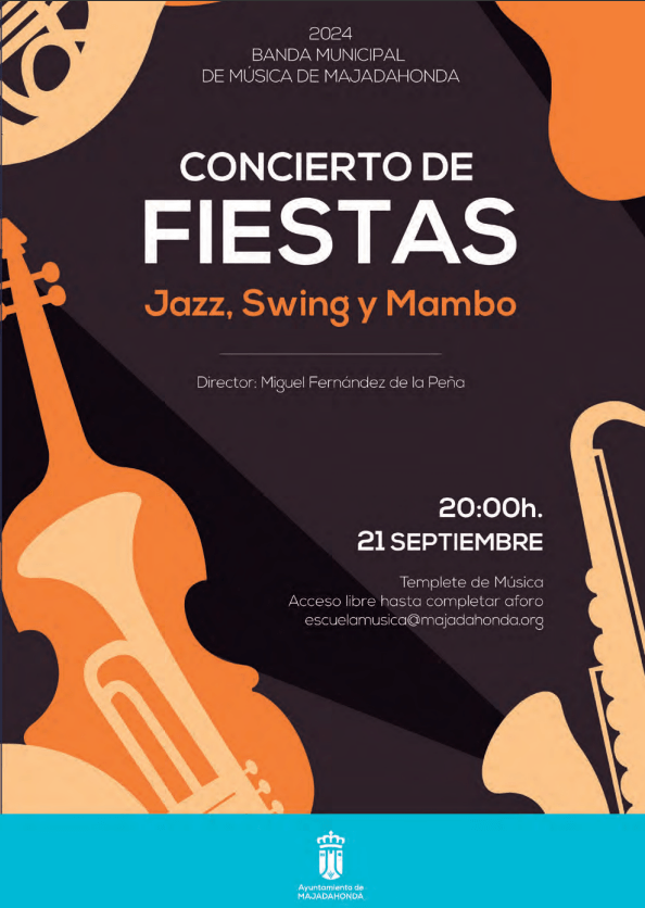 CONCIERTO DE LA BANDA MUNICIPAL DE MÚSICA DE MADAJADAHONDA. Concierto de Fiestas, Jazz, Swing y Mambo. Dirigida por: Miguel Fernández de la Peña. A las 20:00 horas. Lugar: Templete de Música de la Plaza de la Constitución.