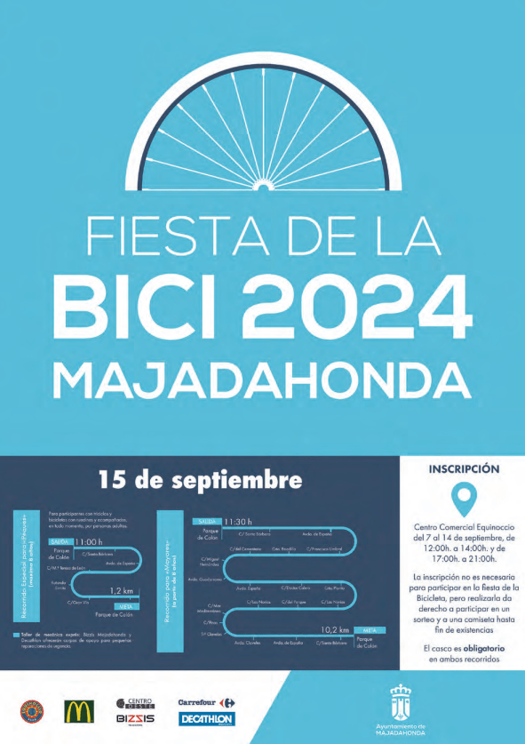 XXIII FIESTA DE LA BICICLETA. Lugar: Salidas desde la Plaza de Colón. Horarios: 11:00 h. Recorrido para peques (1 km): Bicis con ruedines y triciclos acompañados de un adulto).a las 11:30 horas recorrido para “mayores” (11 km): Mayores de 8 años. Obligatorio el uso de casco en ambos recorridos. Información: https://deportes.majadahonda.org/. Inscripción: Centro Comercial Equinoccio del 7 al  14 de septiembre, de 12:00 h. a 14:00 h. y de 17:00  h. a 21:00 h. La inscripción no es necesaria para participar en la fiesta de la Bicicleta, pero realizarla da derecho a participar en un sorteo y a una camiseta  hasta fin de existencias. Organiza: Concejalía de Deportes. Colaboran: Club Ciclista Majadahonda, Decathlon Majadahonda, Equinoccio, Centro Oeste, Carrefour, McDonald’s, Bizzis Majadahonda.