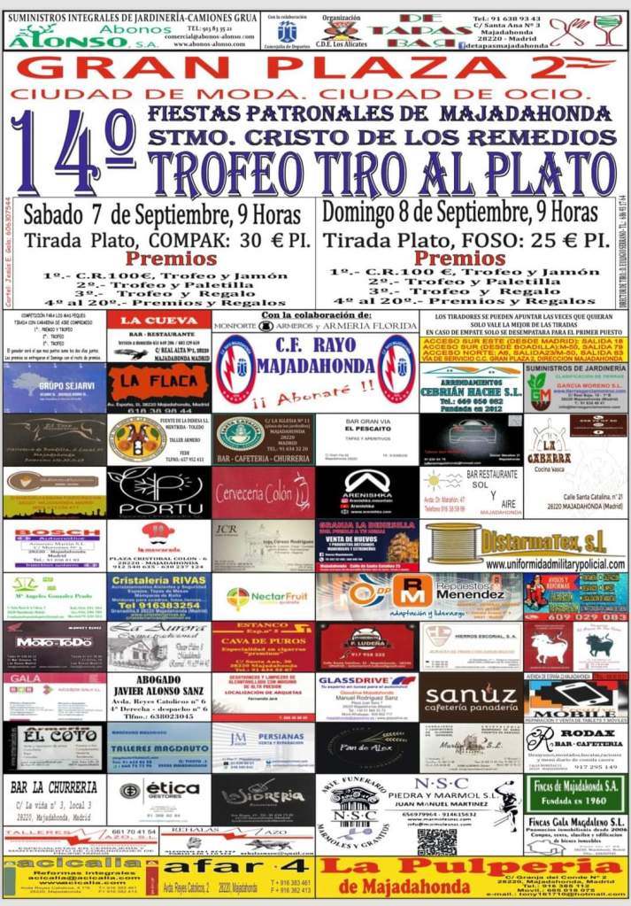 XIV TROFEO DE TIRO AL PLATO. Lugar: En el Paraje denominado Baedón, situado en la Carretera de Majadahonda a Villanueva del Pardillo, salida 79 y 82, M50.Hora: A partir de las 09:00 horas. Inscripciones: El mismo día en el Campo de Tiro a las 09:00 horas. Modalidad: Tiro al plato tirada abierta. Información: D. Miguel Pérez Grajera 630 18 71 79 / D. Esteban García 607 97 90 34. Entrega de Trofeos: Ambos días 15:30 horas aprox. Organiza: CDE Majadahonda Los Alicates.