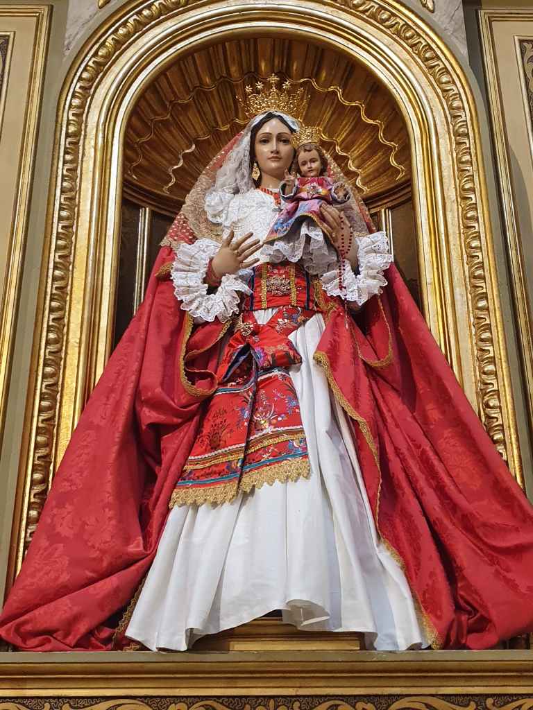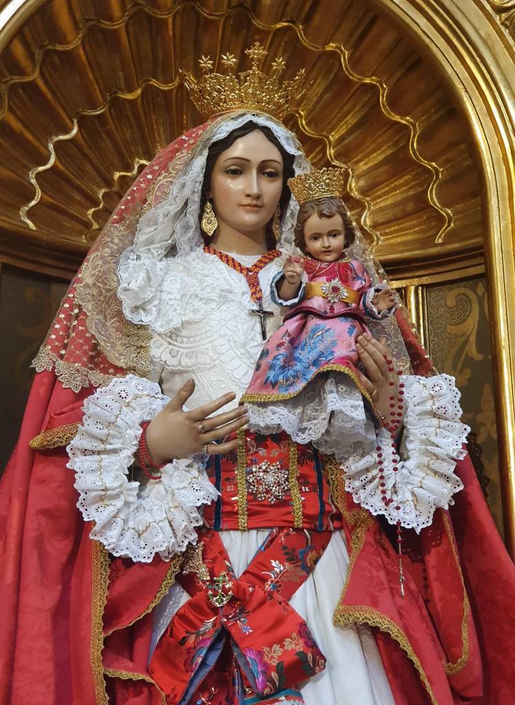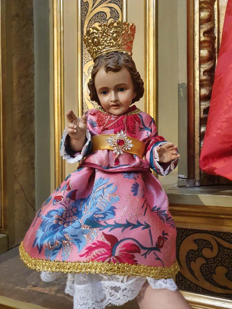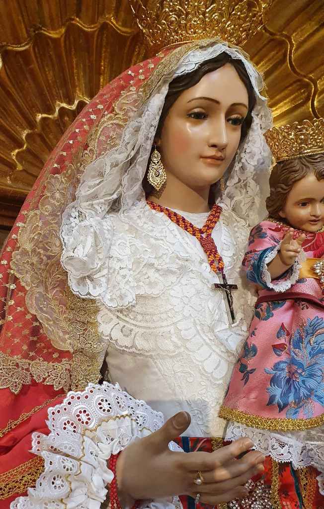 Para esta ocasión ante este tiempo litúrgico de festividad en el que estamos inmersos, el diseñador ha optado por el color “rojo”, elaborando para Ella un nuevo fajín brocado con motivos florales, y por primera vez para el Niño Jesús, que porta en brazos, ha realizado un traje bordado en rosa con motivos florales, “Una estampa nueva y única” como así lo describe David de Calle.