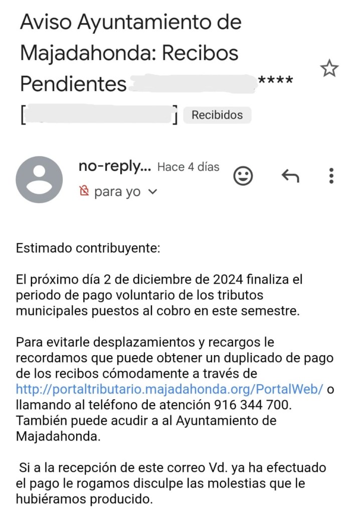 Eso sí… envía a tu correo personal una información muy importante para las arcas municipales, “Estimado contribuyente: El próximo día 2 de diciembre de 2024 finaliza el periodo de pago voluntario de los tributos municipales puestos al cobro en este semestre”, invitación personalizada e ineludible, para que luego digamos que no estamos informados.