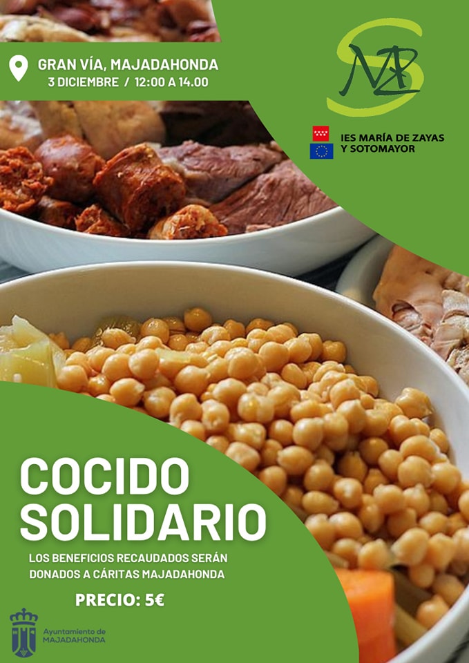 Los alumnos de Hostelería del IES María de Zayas y Sotomayor, este martes 3 de diciembre (2024), van a ser los artífices de una loable iniciativa que tendrá lugar de 12:00 a 14:00 horas, en la Gran Vía de Majadahonda. Hora y lugar donde se podrá degustar un “auténtico Cocido Madrileño”, cuyo principal ingrediente es la “Solidaridad”, la cual será manifestada con una aportación de 5€ por persona para todos aquellos que quieran colaborar y degustar esté afamado y típico plato madrileño, “los beneficios recaudados serán donados a Cáritas Majadahonda, que trabaja incansablemente para apoyar a quienes más lo necesitan en nuestra localidad” según manifiestan los promotores del evento. Además, todos los participantes tienen la opción de entrar en el sorteo de una invitación para dos personas en el Aula-Restaurante de este centro de formación en horario de comida, un agradecimiento que estas jóvenes promesas de la restauración quieren tener con todos aquellos que colaboren con esta gran causa.