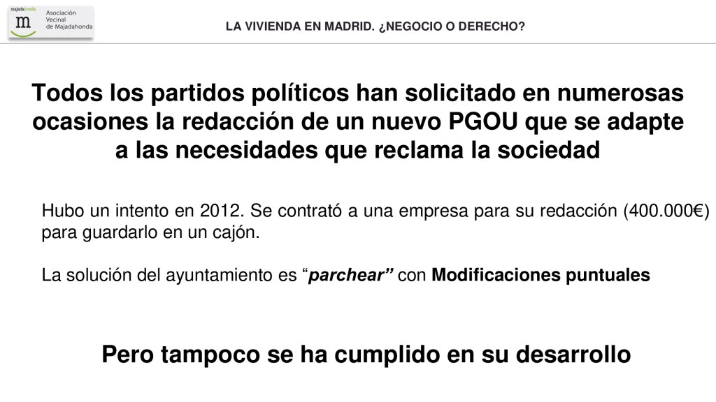 Todos los partidos políticos de la oposición, sin exclusión de ninguno, UPyD, Centristas, Ciudadanos, PSOE, Somos Majadahonda, Izquierda Unida, todos durante la legislatura hemos solicitado que se cambie el plan general de la organización cuando fui concejal y los solicité, personalmente, en varias ocasiones.