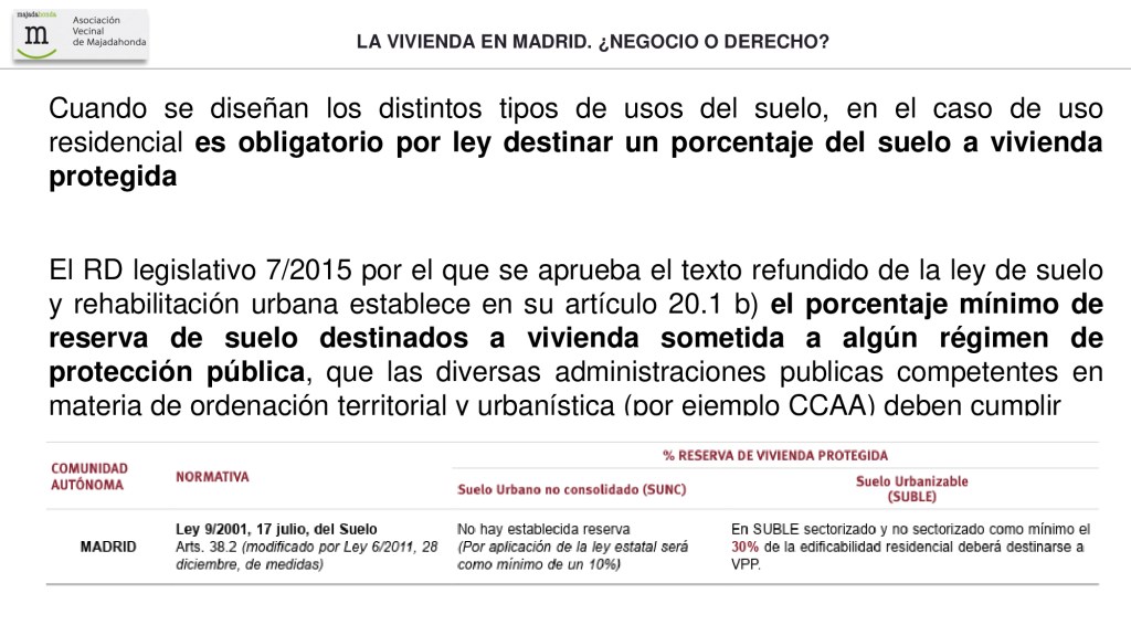 La ley que está en vigencia actualmente es el Real Decreto Legislativo de 7 / 2015. En esa ley se establece cuál es el porcentaje mínimo que hay que destinar a vivienda sometida en algún régimen de protección pública.