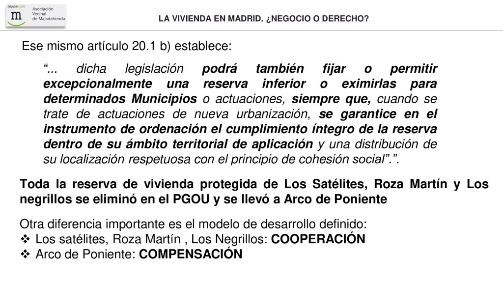 ¿Qué significa? Significa que la ley te permite que extraigas toda la vivienda protegida, siempre y cuando ese porcentaje de vivienda protegida te lo lleves a otro sitio del término municipal que además garantice el principio de cohesión social. Bueno, aclaro el Sr. Soto, pues toda la reserva de vivienda protegida que estaba en los Satélites, en Roza Martín y en Los Negrillos, se eliminó del plan y se trasladó a otra zona que es Arco de Ponente.