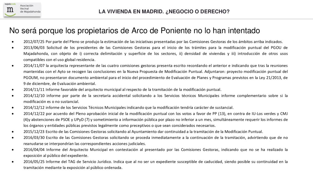 Y no será porque los propietarios de Arco de Poniente no se hayan movido. Solo desde el 2012, estos son un resumen de todas las iniciativas que han hecho los propietarios para poder movilizar Arco del Poniente (imagen adjunta). Y me paro en el 2018 porque todavía hay algunas más.