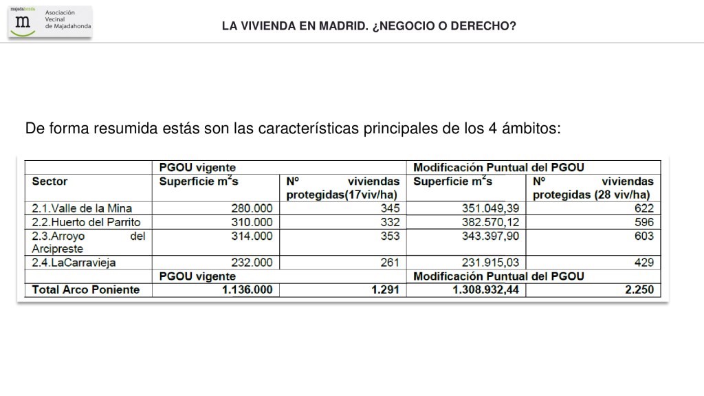 Para finalizar su completa exposicion informo ademas que el Ayuntamiento de Majadahonda contestó en noviembre del 2024 y determinó que solo tenía de las zonas que le quedaban por desarrollar un ámbito que pudieran cumplir, que era el Carril del Tejar. La zona, se sitúa dónde está el Plaza Norte. En esa zona hay suelo terciario principal y cumpliría con las condiciones de esa ley y podría transformarse en vivienda protegida y, por tanto, aumentar la vivienda protegida prevista, en los mismos porcentajes que dice la ley.