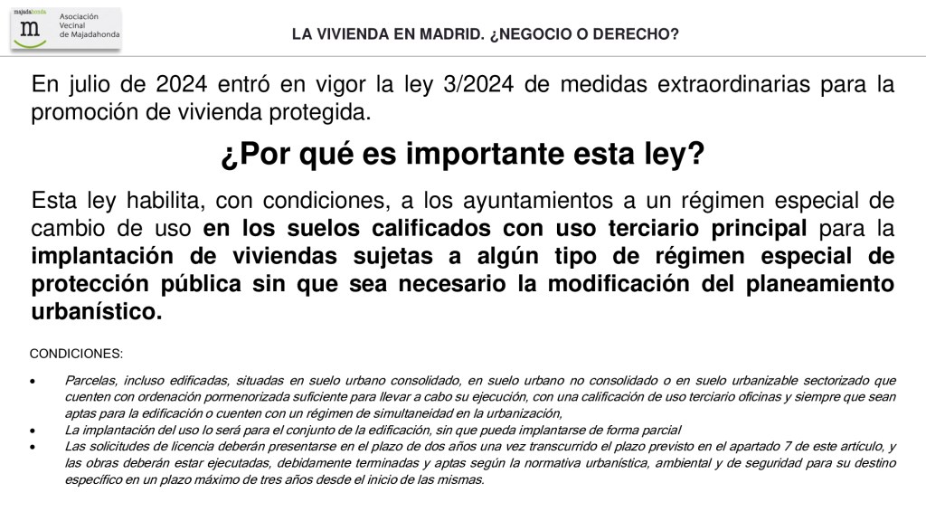 En julio de 2024 entro en vigor la ley que reforma las medidas extraordinarias para la reforma de vivienda protegida. ¿Por qué les menciono esta ley? Porque esta ley habilita a los ayuntamientos a que todo aquel suelo que tengan de nivel terciario principal lo puedan transformar en suelo de vivienda pública protegida sin necesidad de ninguna actuación urbanística.