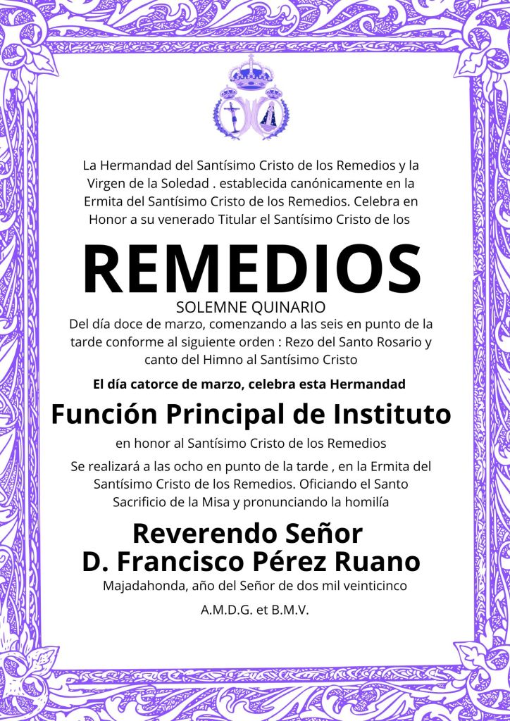 Este 14 de marzo, tercer día del Solemne Primer Quinario, que la Hermandad del Santísimo Cristo de los Remedios y la Virgen de la Soledad está celebrando en Honor a su venerado Titular, como Función Principal de Instituto se ofició el Santo Sacrificio de la Misa a cargo del párroco Francisco Pérez Ruano, seguidamente se procedió a desvelar el cartel que este año anunciará la conmemoración de los acontecimientos de la pasión, muerte, sepultura y resurrección de Cristo, que constituyen el misterio pascual, el centro de la vida del Señor.