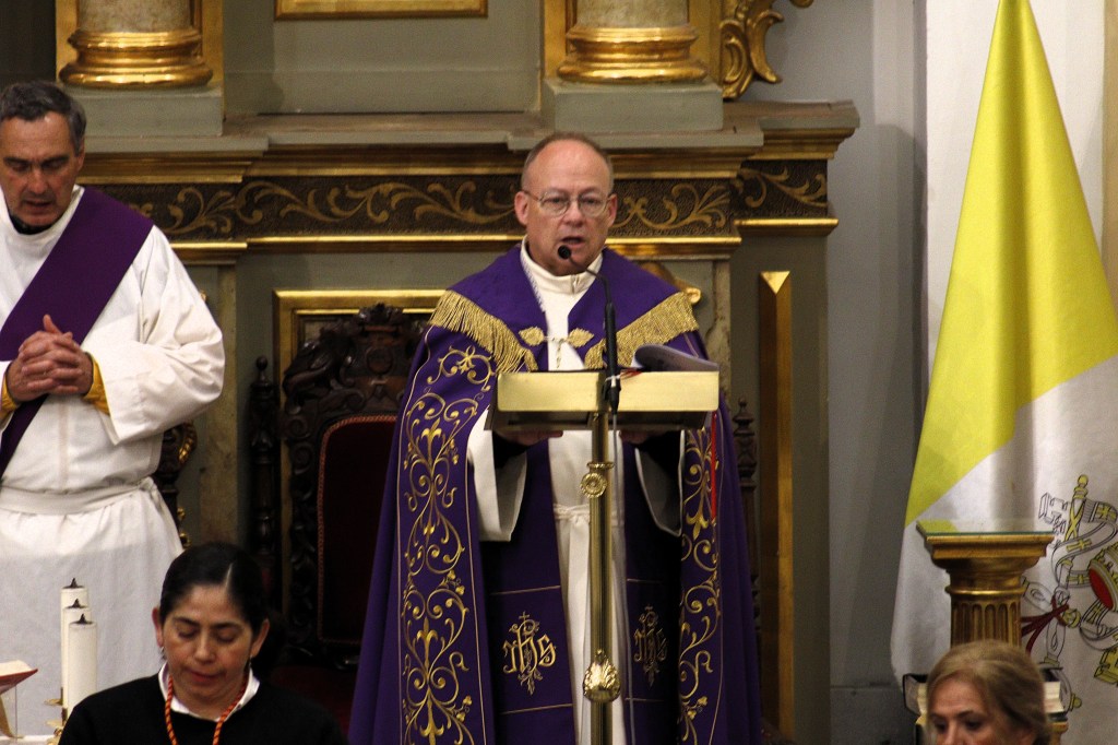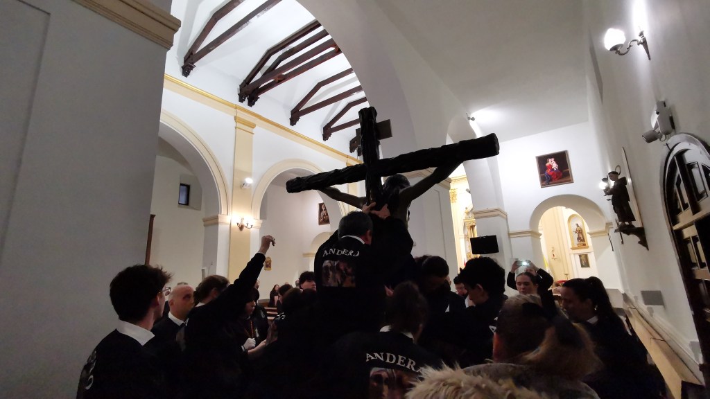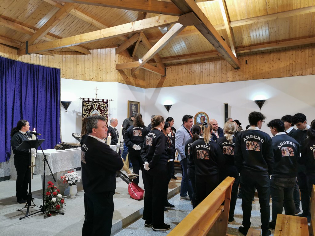 Donde tuvo lugar el Vía Crucis, ante la imposibilidad de realizarlo durante el recorrido. Una vez más fueron los anderos y anderas los que por turnos, al igual que durante el recorrido, mantuvieron en pie a nuestro Patrón, mientras se procedió a dar lectura a las 14 estaciones que conmemoran el camino de Jesús de Nazaret desde su condena hasta su resurrección.