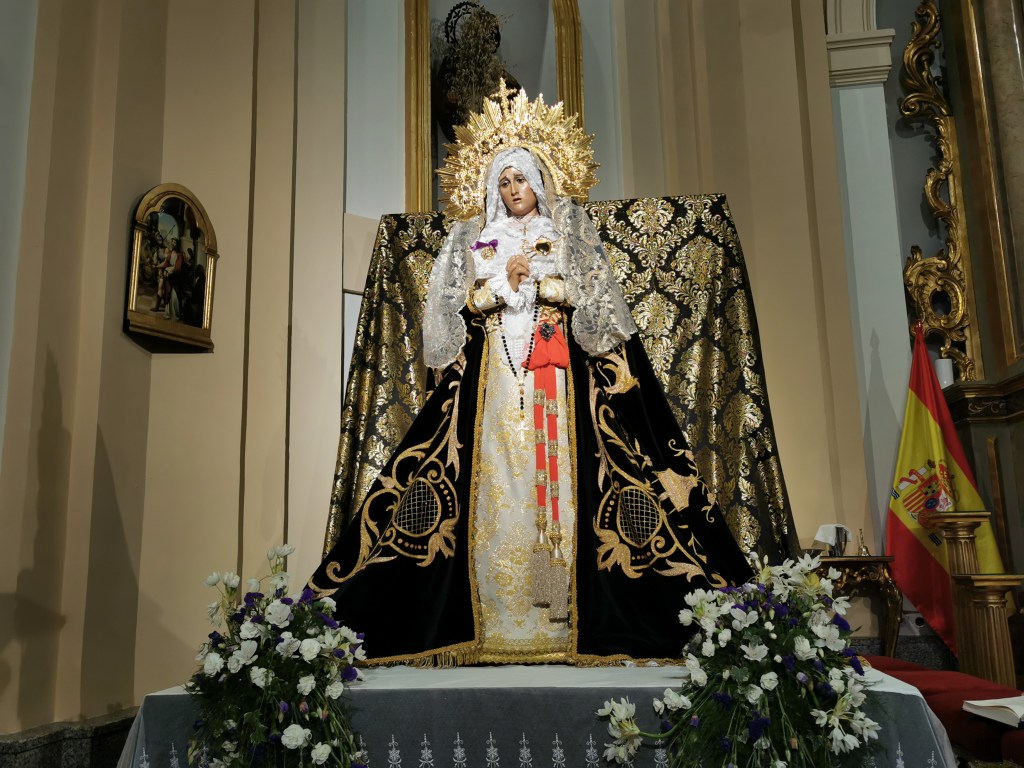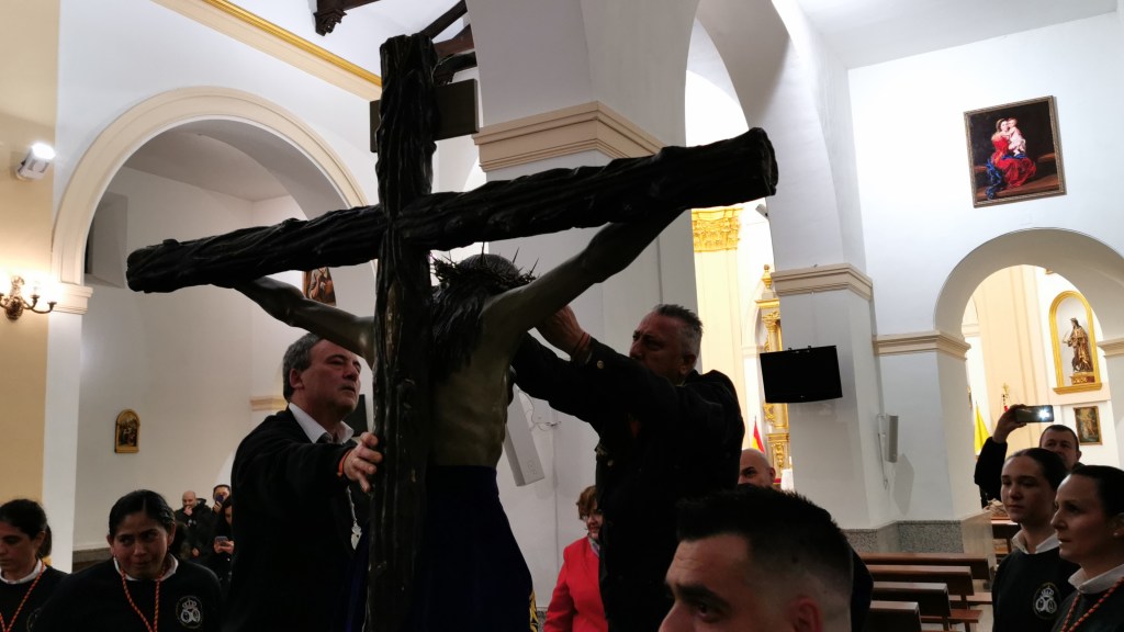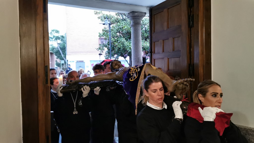 En el exterior, a modo de sudario se cubrió con un plástico, para evitar que las intermitentes gotas de lluvia pudiesen llegar a dañarlo. El recorrido se acortó por la calle Monjitas hasta la parroquia, se aceleró el paso, y en tan solo una ocasión se intentó despojarle de esa cubierta protectora, pero la recurrente lluvia hizo de nuevo su aparición, llegando así tapado hasta las puertas del templo.