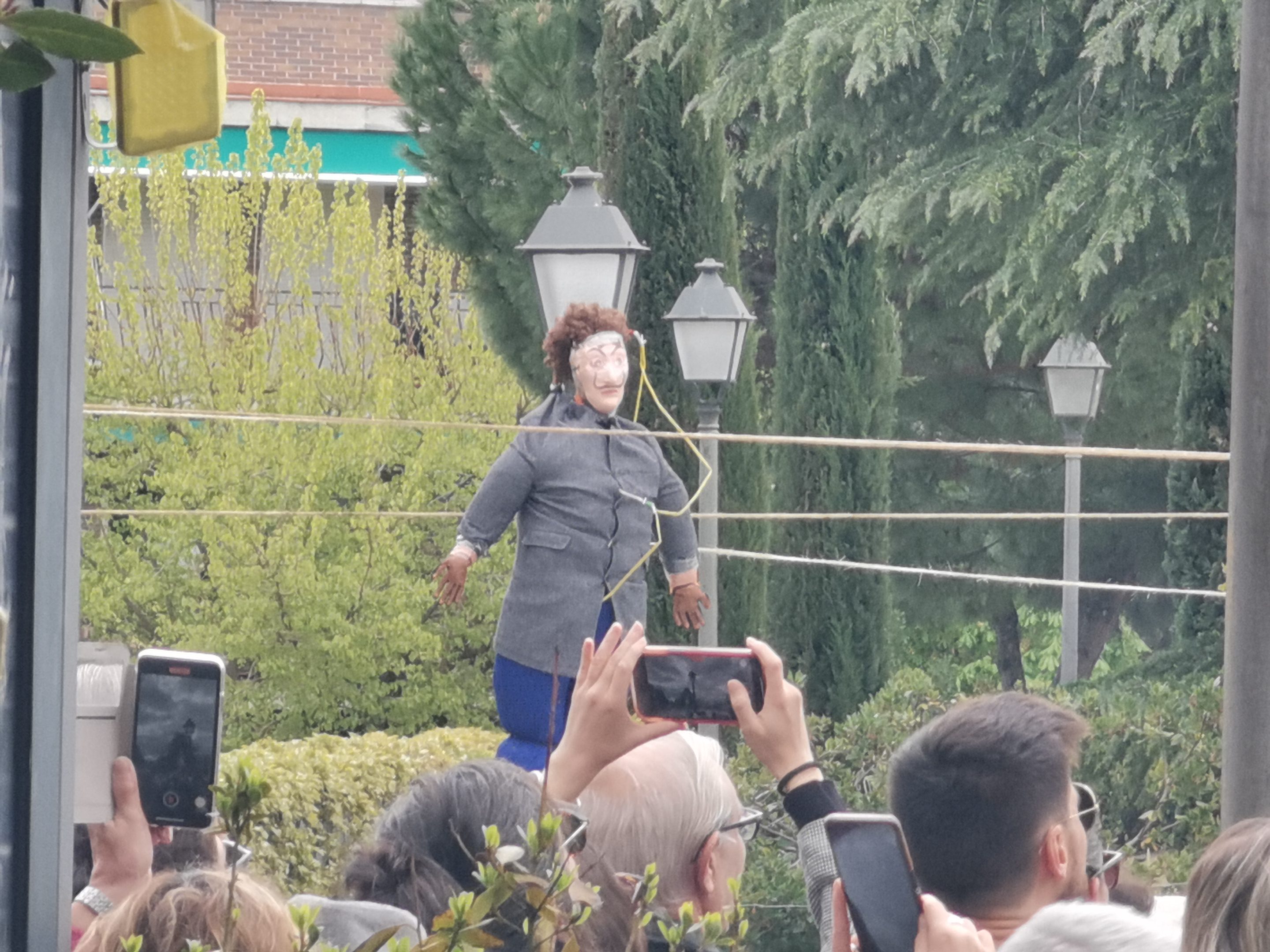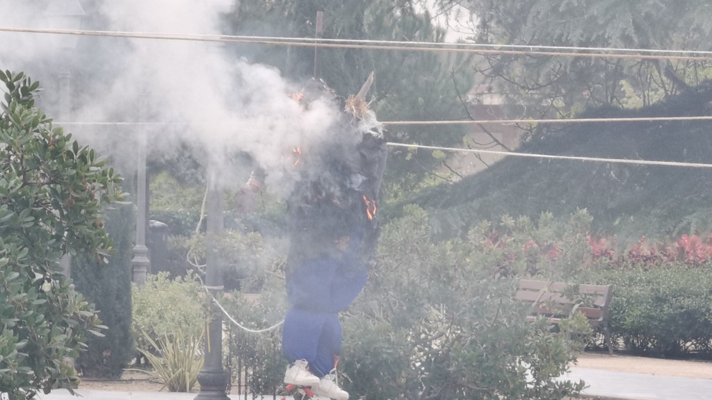 Seguidamente, se procedió a la Quema del Judas, un tradicional acto que el Ayuntamiento en los últimos años ha transformado en el “Estallido del Judas”, ya que la cantidad de pólvora utilizada le hace estallar más que quemarse. A quien corresponda, la simbología del Judas es que las llamas acaban con el hombre viejo, y como gesto de resurrección renace un hombre nuevo para enmendar los errores del pasado, y no que los asistentes se lleven como recuerdo un trocito del muñeco pegado al cuerpo, además de un intenso olor a pólvora y la necesidad de adquirir un audífono.