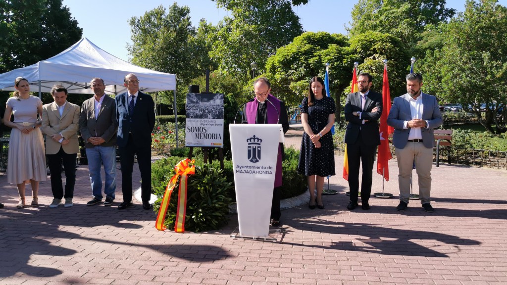 El arcipreste de Majadahonda y Párroco del Beato Manuel Domingo y Sol, Antonio Peña, dedicó la siguiente oración “Dios todopoderoso y eterno de infinita misericordia y bondad, en este día en que conmemoramos el 28 aniversario del asesinato de Miguel Ángel Blanco, elevamos nuestras oraciones por su eterno descanso y el de todas las víctimas del terrorismo. Concédele Señor el descanso y la paz, reconforta a sus familias y a quienes les extrañamos con la esperanza de la vida eterna. Son hijos tuyos, son hermanos nuestros”. A la que añadió una petición “Te pedimos, Señor de los pueblos y Rey de las naciones, por España, por nuestra Comunidad de Madrid, por nuestra querida Majadahonda y especialmente por todos los pueblos que sufren el zarpazo de la violencia y del terrorismo. Te pedimos por todas las mujeres y hombres que cada día renuevan su compromiso con nuestra seguridad y nuestra protección. Príncipe de la Paz, Señor crucificado, Jesucristo Resucitado, compadécete de nosotros y escucha nuestras súplicas”, para seguir rogando “Te pedimos que nos ayudes a acabar con esta lacra de la sociedad que es el terrorismo y cualquier forma de violencia y de terror. Ayúdanos a construir una sociedad donde podamos vivir amándonos los unos a los otros, como tú nos has amado. Que busquemos decididamente la unidad y el bien común”. Para finalizar con un deseo de “Una sociedad sostenida por la verdad, la justicia, el respeto a la dignidad de las personas y el Amor. Miguel Ángel Blanco, cada una de las víctimas del terrorismo, son un valor para buscar la verdad y reaprender a vivir. Todo esto te lo pedimos en silencio, por Jesucristo, nuestro Señor”. Un minuto de silencio en recuerdo de las víctimas puso el cierre al acto.